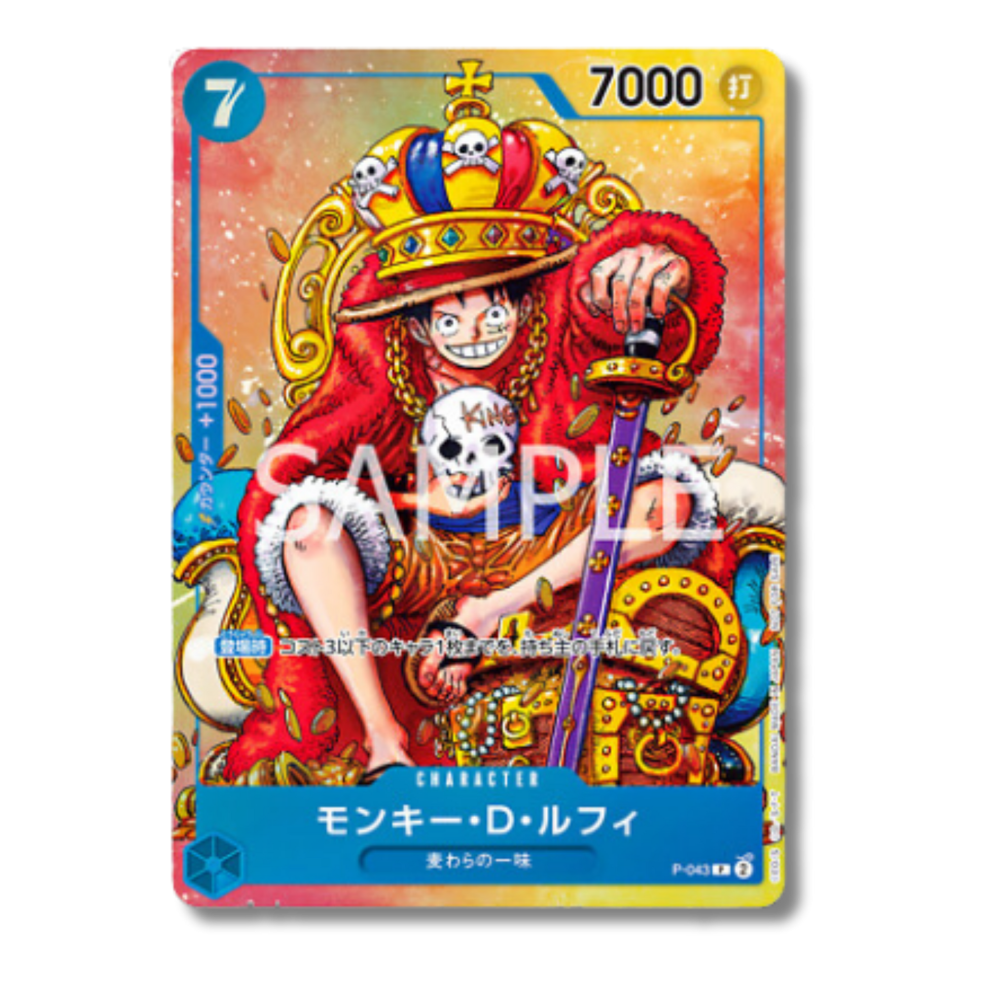 La Monkey D. Luffy P-043 è una carta promozionale ufficiale del One Piece Card Game, distribuita in esclusiva come allegato della celebre rivista giapponese Weekly Shonen Jump. Si tratta di una promo molto apprezzata dai collezionisti, grazie alla sua distribuzione limitata e al forte valore simbolico legato alla pubblicazione storica che ha dato origine a One Piece.