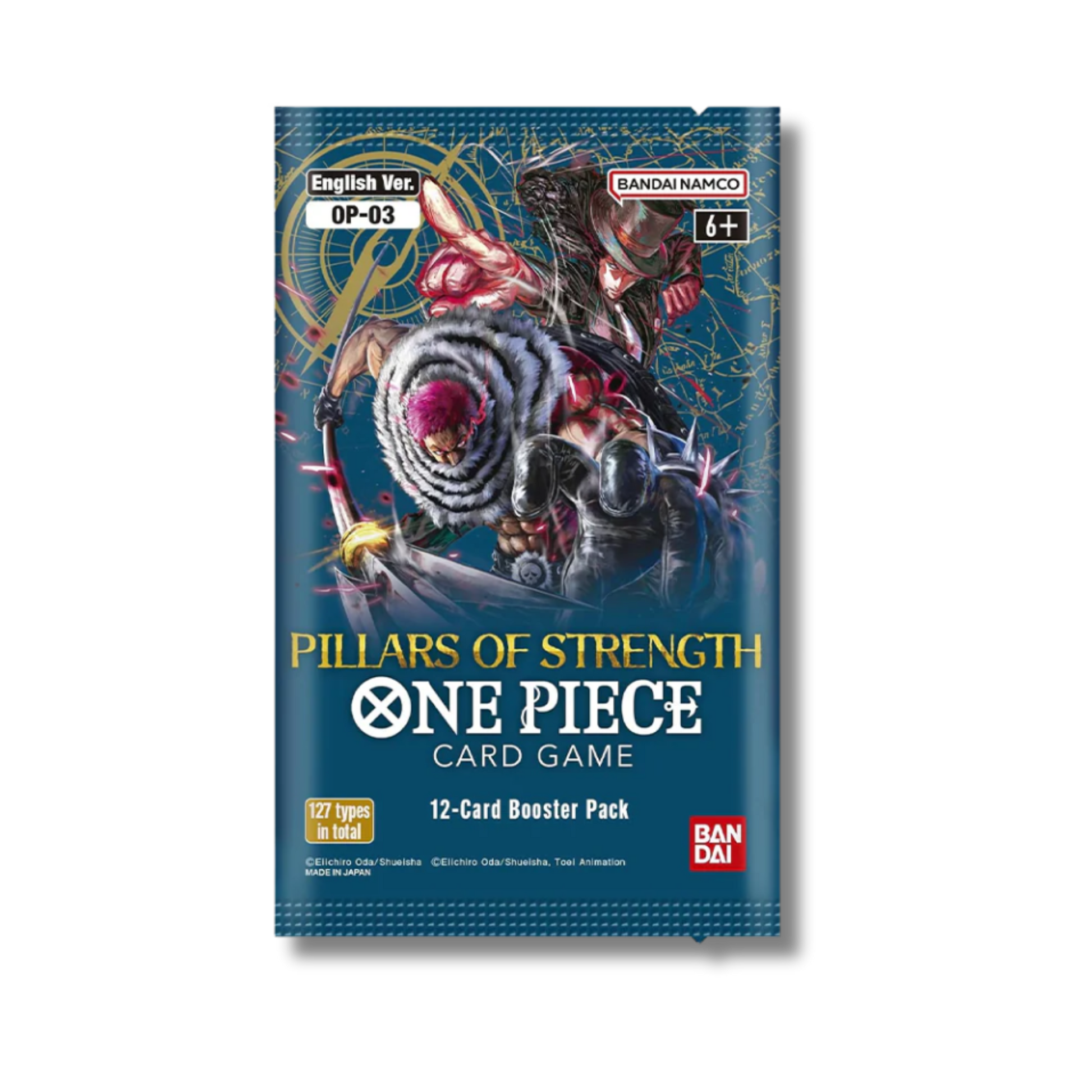 Il terzo capitolo della serie TCG del mondo One Piece in lingua inglese: OP03 – Pillars of Strength (ENG). Questo set introduce nuove strategie, nuovi personaggi antagonisti tratti da East Blue, Water Seven e Whole Cake Island, e una nuova “colore giallo” (“Yellow”) che amplia le combinazioni di gioco.
